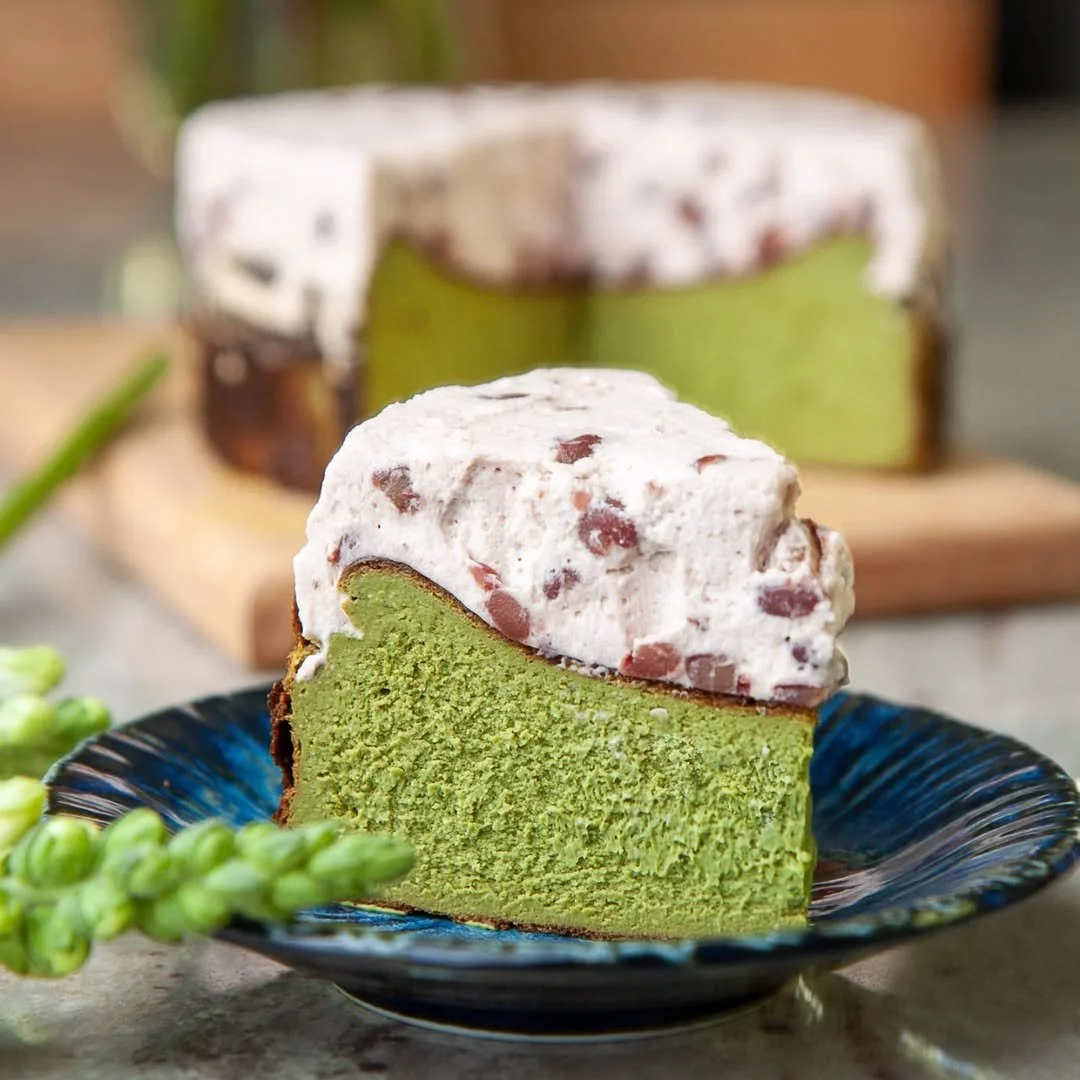 Experience a slice of heaven! Our Green Tea Cheesecake is a beautiful blend of creamy matcha and a luscious red bean cream, complete with real red beans for that authentic taste and texture. It's a dessert that's both elegant and delicious!