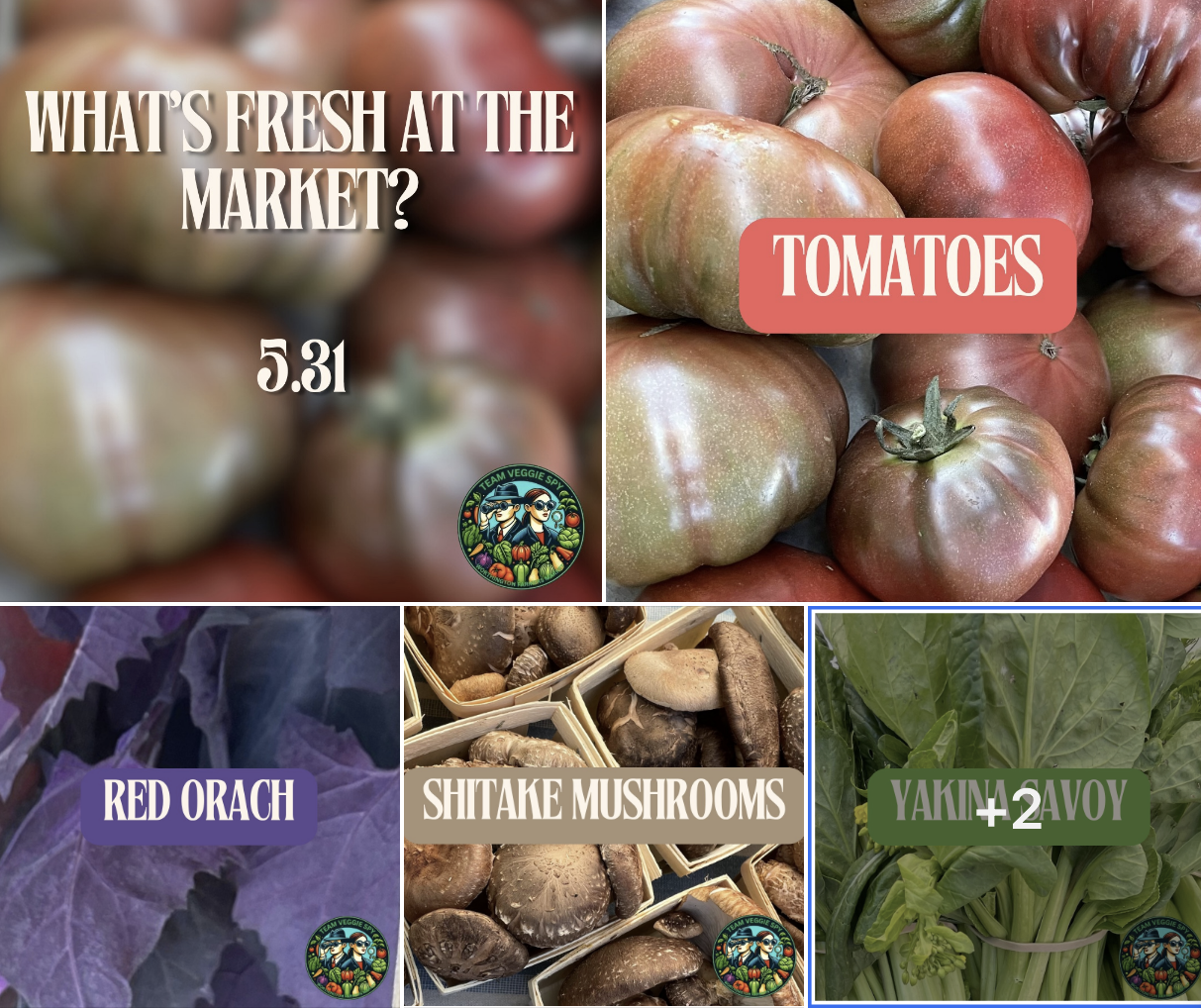 The veggie spies have confirmed.. folks, we have tomatoes! There's also spinach-like red orach, shiitake mushrooms, yakina savoy, zucchini and more!
