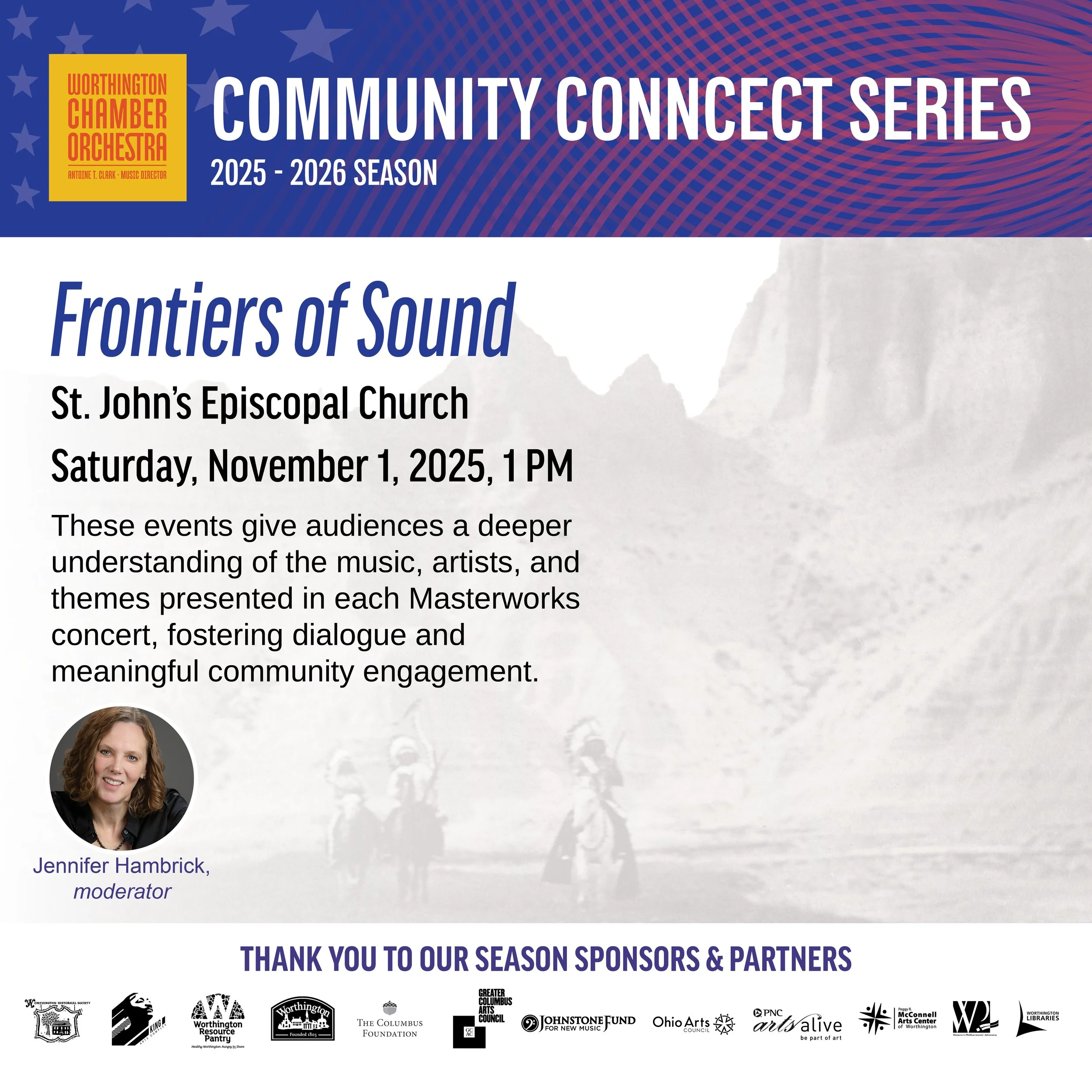 Community Connect Series: Frontiers of Sound Saturday, November 1, 2025 1:00 PM 2:30 PM St. John's Episcopal Church 700 High Street Worthington, OH, 43085 United States (map) Google Calendar ICS Community Connect Series: Frontiers of Sound These events give audiences a deeper understanding of the music, artists, and themes presented in each Masterworks concert, fostering dialogue and meaningful community engagement. Buy Tickets